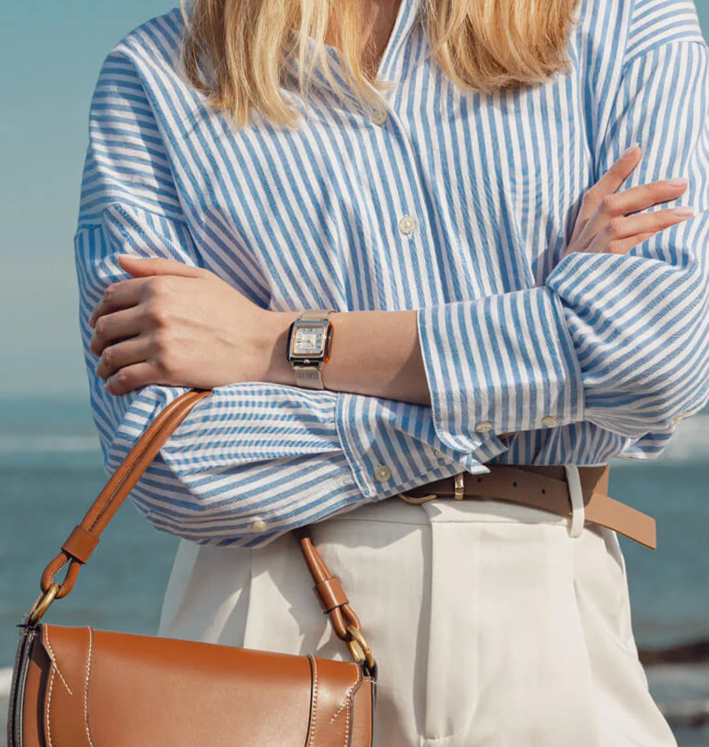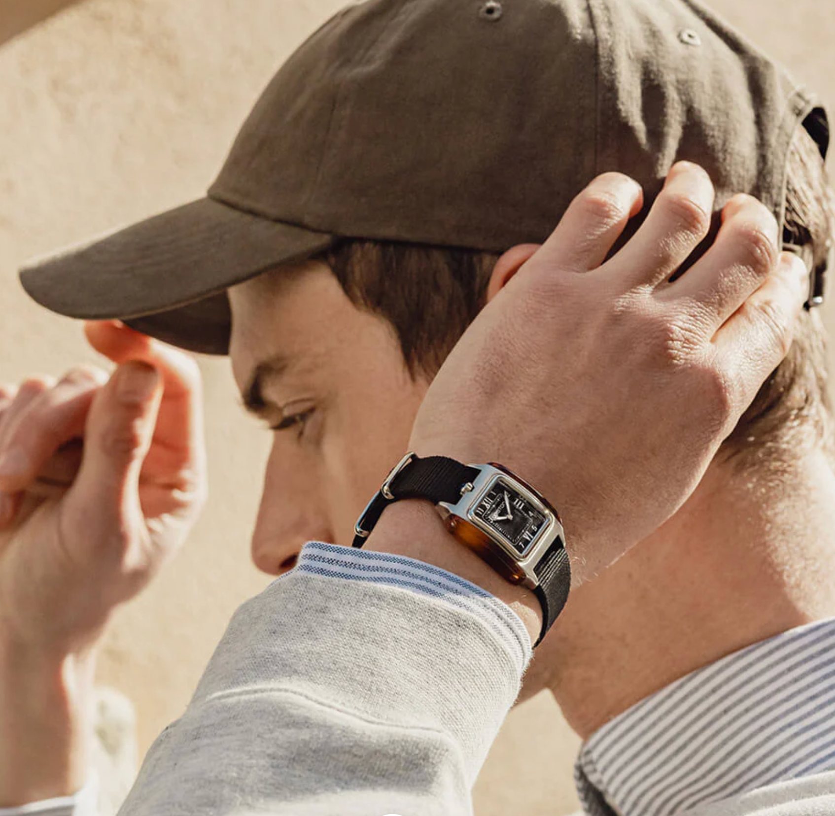 HM Streamliner Kennedy watch, 30x30 mm. Square brushed steel case with tortoiseshell acetate sides. Crown at 12 o'clock with a lapis lazuli cabochon. Double-layered white dial, black subdial with recessed Roman and Arabic numerals, and a central section with a railway minute track and guilloché pattern decoration. Hours and minutes. Dauphine-style steel hands with SuperLuminova® inserts. Domed K1 ultra-resistant crystal. Interchangeable 18 mm NATO strap, exclusive to Briston: taupe with steel buckle. Quartz movement: Swiss Ronda Normtech 751. Water resistance 50 m/5 ATM.