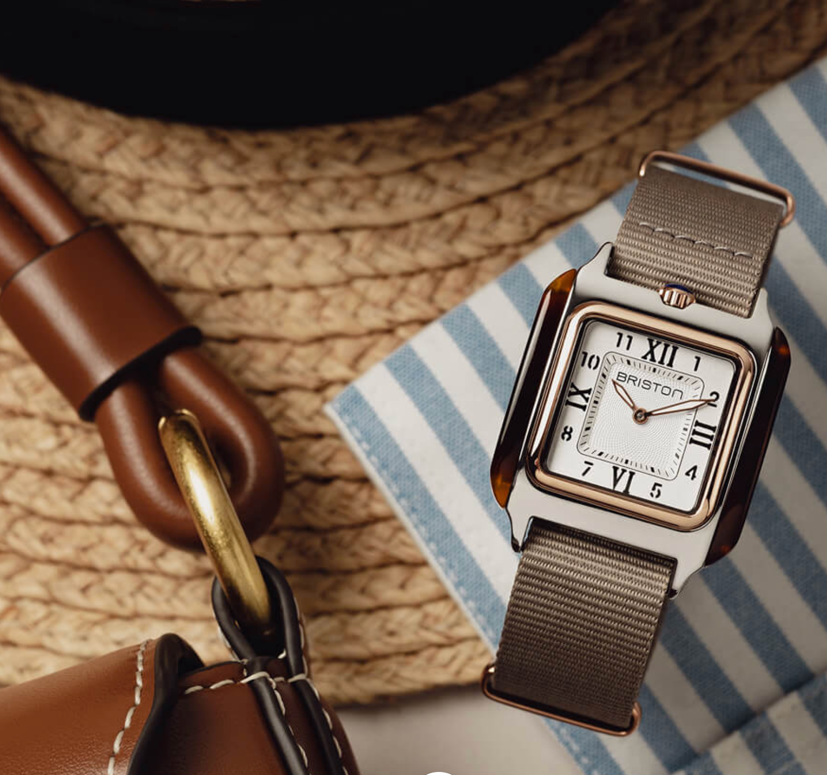 HM Streamliner Kennedy watch, 30x30 mm. Square case in polished steel and rose gold (PVD) with tortoiseshell acetate sides. Crown at 12 o'clock with a lapis lazuli cabochon. Double-layered white dial, black subdial with recessed Roman and Arabic numerals, and a central section with a railway minute track and guilloché pattern decoration. Hours and minutes. Dauphine-style hands in rose gold-finished steel with SuperLuminova® inserts. Domed K1 ultra-resistant crystal. Interchangeable 18 mm NATO strap, exclusive to Briston: taupe with a rose gold-finished steel buckle. Quartz movement: Swiss Ronda Normtech 751. Water resistance 50 m/5 ATM.