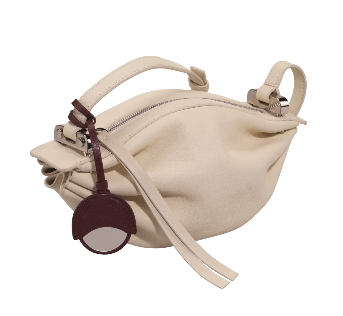 Este elegante accesorio de cuero en forma de luna se adhiere a su bolso y oculta un espejo, que se revela con un simple deslizamiento del panel superior.