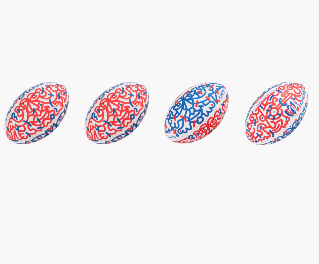 Né du mouvement graffiti, Louis Bottero investi le ballon de rugby avec un style spontané et des symboles inspirés de la culture urbaine, façon Color Block.